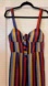 Multiple colored romper with removable straps and tie on top. 100% polyester. Ankle length. Perfect for brunch or a fun dinner!