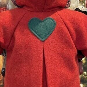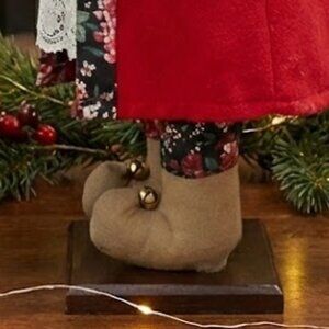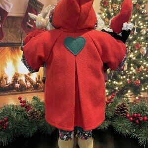 Christmas doll, Santa Claus figure, Old World Santa, Father Christmas, red, green, black, white, floral print, velvet, lace, knit fabric, synthetic hair, faux fur trim, bells, elf, rabbit accessory, detailed costume, handcrafted, standing decoration, collectible, holiday decor, winter, vintage-inspired, German, House of Hatten