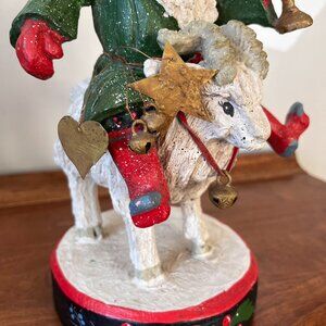 Darling House of Hatten Spirit of Gifting Collection figurine featuring a rosy-cheeked Santa Claus / Father Christmas riding a ram or goat while holding a gold goblet. Santa wears a wreath on his head and has a metal star, heart and bells tied around his waist.
