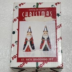House of Lloyd Santa Seasoning Set Christmas Holiday Salt and Pepper shakers. Box has some damage- tears on the image, Items are in New condition and do not appear to have been ever used. Possibly just displayed. 2 Santa's with alternating colored outfits to tell them apart. Come shaped with stoppers on the bottom. Measures almost 4.5". Please see all pictures for details.