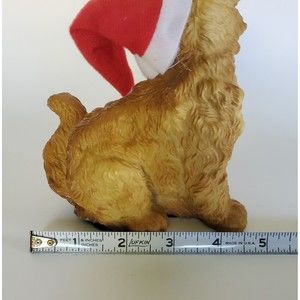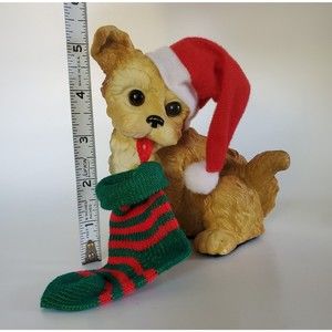 House of Llyod: Christmas Around the World Collection ~ Resin Puppy Carrying an X-mas Stocking Wearing a Santa Hat ~ Vintage 1990's 5.5"tall and 4.5" across.