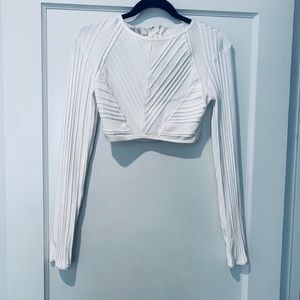 Only been worn once. Dry cleaned only. This body con long sleeve crop top is perfect for any occasion. Dress it up with a matching body con skirt or wear it out with jeans.