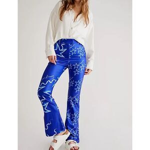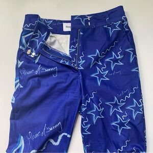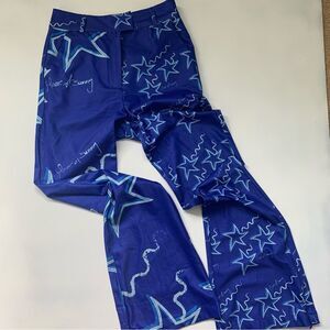 The glossy satin Party Pants have become a House of Sunny classic. Ultra high-rise silhouette with a fitted leg that flares below the knee. Topped with a logo patch at the back and a zipped slit at the ankle. Excellent preowned condition. Minor flaws in fabric as pictured, wear to the bottom / backside of pant hem as pictured.