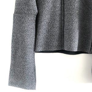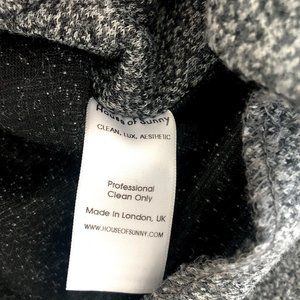 Indie British brand House of Sunny's beautiful knit sweater with extra long bell sleeves elevates any outfit. This textured mixed gray knit has detailing on the front and across the sleeves. Worn once and in excellent condition. Fabric tag removed – has a midweight, textured wool-blend feel. This is a size UK 6 which converts to a US 2, but I think it fits more like a US 4 (see measurements below). Made in London.