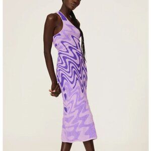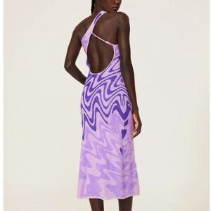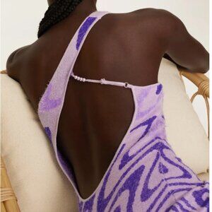 Purple printed viscose blend (60% Viscose, 40% Nylon). Sheath. One shoulder. Sleeveless. Pull on. 45.5" from shoulder to hemline.