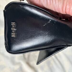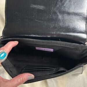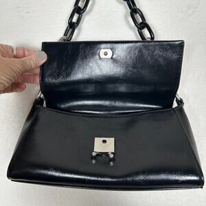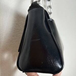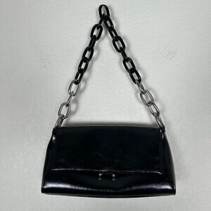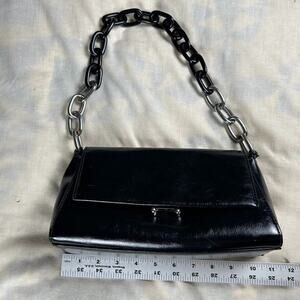 Gently used Vegan leather bag with spring closing latch. Chain is lightweight silver metal and black plastic. Some scratches shown in photos.