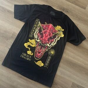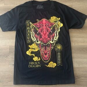 Brand new Game of Thrones House of the Dragon Caraxes graphic tee. Black shirt with striking red/yellow dragon artwork and Asian-inspired lettering. 100% cotton, officially licensed HBO merch. Great for fans of the fantasy series.