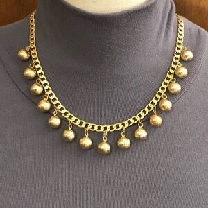 This necklace, perfect for costumes or cosplay, features a chunkier gold plated cable chain with 15 spherical gold plated charms (each about 9 mm in diameter) dangling from the center. It drapes very nicely around your neck and makes for a great statement piece. It is very adjustable from 16 to 24.25 inches, so it can be worn with a variety of different necklines. This replica has been newly handmade just for you, and the length can be made shorter or longer upon request.