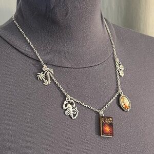 This unisex necklace features (from left to right), first, a palm tree oasis charm, for the oasis that Matt discovers while escaping across the border, which represents hope. Next is a scorpion charm, since scorpions are the emblem of the Alacrán family and symbolize El Patrón’s cruelty and his connection with his clone, Matt. In the center is a book cover pendant. To the right is a medallion charm of the Virgin of Guadalupe, for the Virgin of Guadalupe statue by Matt's bed, which serves as a symbol of Matt's inherent morality and goodness. Last is a charm of poppy flowers, since poppies represent the pervasive prejudice and oppression in the dystopian world of Opium. This necklace has been newly handmade just for you, and is adjustable from 18.5 to 26.5 inches (can be altered upon request).