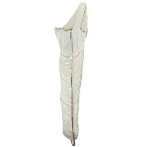House Of CB Valentina ivory asymmetric cutout ruched bodycon midi dress.
