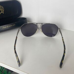 House Of Harlow 1960 TILDA Gunmetal Aviator Sunglasses with Hard Shell Case 58 14. Features gunmetal grey metal frames in a modern aviator style, tortoise shell on half the arms and ear pieces, non-gradient lenses with a plum purple tint, adjustable wire & rubber nose pads. Comes with hard shell case and original case cardboard wrapper. Gently worn and stored in case but they do show light signs of wear: small scratches on lenses that aren't too visible & don't seem to obstruct a straight view, light rub off of lettering printed inside the arms, case & wrapper show scratches, dents, dust, wear and case liner needs to be re-glued to the shell.