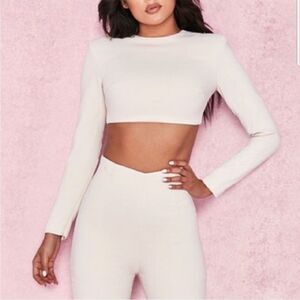 House of CB Cream Eizelle Long Sleeve Crop Top. Structured too with shoulder pads, zipper back and zipper cuffs.