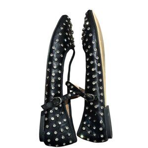 Black faux leather flats with silver rhinestones and a classic Mary Jane strap.