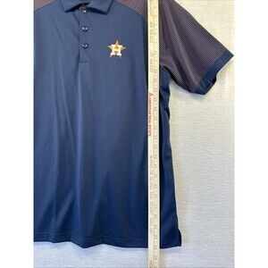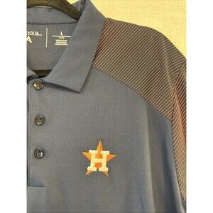 Houston Astros MLB Antigua Polo Shirt Mens Large Blue & Orange Striped Polyester. Condition is Used. Shipped with USPS Ground Advantage.