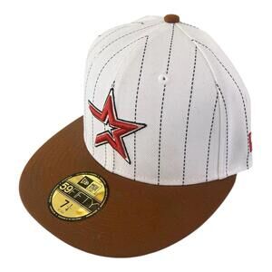 The Houston Astros Pin Strip Fitted Hat Cap by New Era is a stylish and versatile accessory for men. Made of lightweight polyester fabric, this baseball cap features a solid beige color with a sports-themed design, making it perfect for various occasions such as travel, parties, or casual outings. The hat is sized 7 1/4 and showcases the team logo patch as part of its 45-year anniversary celebration. Whether it's winter, summer, fall, or spring, this cap provides a comfortable and fashionable option for any season.