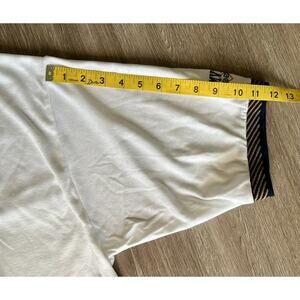 Made in the USA from 100% combed cotton, with navy blue and gold striped collar and cuffs.
