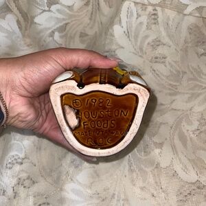 The Houston Food Honey Pot is a vintage ceramic item from 1982. This original piece adds a touch of nostalgia to any kitchen or dining area with its unique design and vintage appeal. Its small size makes it a charming addition to a collection of kitchen decor or as a functional container for storing honey or other sweeteners.