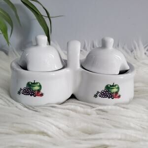 Houston Harvest vintage double jam pot server with a fruit design on the front and handle in the center. Serving spoons are not included. This server is in excellent (no chips, no cracks, or damage and comes from a smoke and pet-free environment).