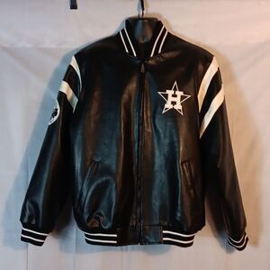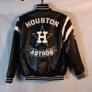 This like New stylish black and white men's Houston Astros leather jacket with a sleek design is a size large with a pit to pit measuring 27" laying flat and a length of 30". All lettering is stitched leather. Two front pockets and full zip. Perfect for casual outings or sporting events.