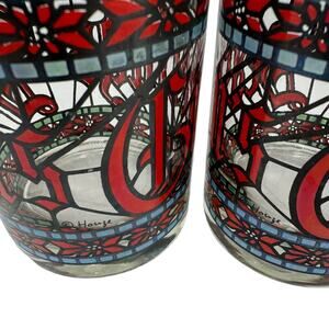 A unique and unusual gift idea for any occasion. These glasses feature a stain-glass look with the wording "Season's Greetings" around the center. These would make a great gift or just around the house for guests.There is some gold loss around the rim, see picture.