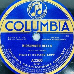 Played by Howard Kopp, this 10-inch 78 RPM shellac record features Maudie Mazurka and Midsummer Bells. Released by Columbia, Catalog A2260, with orchestral accompaniment.