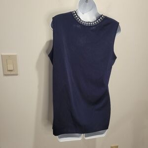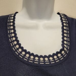 vintage escape navy stretchy ribbed knit tank top/shell with white scalloped collar. pre owned no rips or stains