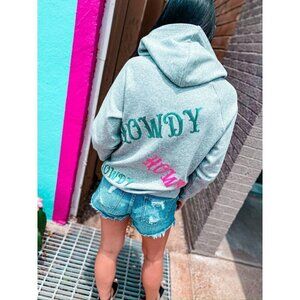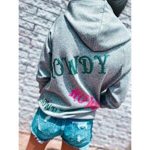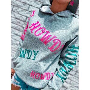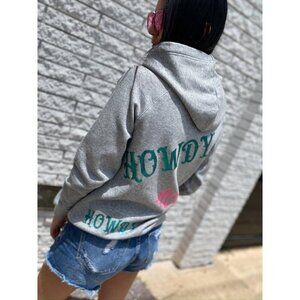 Howdy, howdy, howdy! Get friendly with this unique, comfy, and colorful Spring hoodie. Each letter is carefully crafted of beautiful, sparkly sequins on front, back, and even the sleeves. Heather gray hoodie features from pocket, hood, and lightly fleeced.