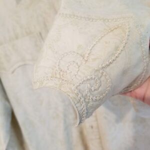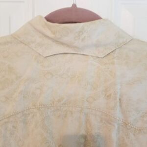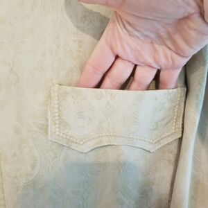 Features: cool western inspired button down shirt, fleur de lis embroidery on cuff, pointed collar wit decorative edging at back neckline, front pockets are decorative, 100% cotton, paisley monochromatic print