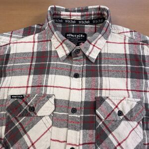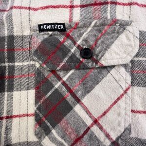 Howitzer Flannel Shirt Mens L Tan Gray Plaid Warrior USA Flag Military