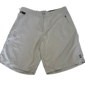 Howler Bros hybrid shorts in gray, size 36. Designed for versatility with built-in belt, drawstring closure, and lightweight quick-dry fabric. Great for hiking, water, or casual everyday wear. Features side pockets, zip fly, and logo detail.