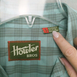 -Features: Button front closure, short sleeves, collared neckline, front pockets, cell phone pocket, Howler Bros logo embroidered on back & side tag, aqua-gray plaid