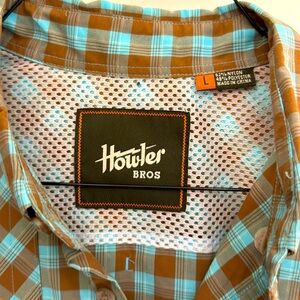 Howler Bros brownish & turquoise-ish plaid shirt. Men’s size large.