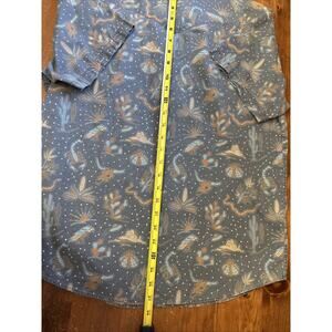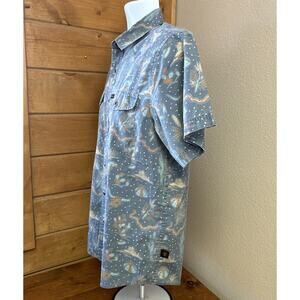Upgrade your wardrobe with this stylish Howler Brothers men's shirt in size small. The blue multi-colored shirt features an eye-catching cacti, scorpion, vulture, and snake pattern, making it perfect for any occasion, whether it's for travel, a party, or casual wear. The shirt has a button-up closure with pearl snap buttons and short sleeves, making it comfortable and easy to wear.