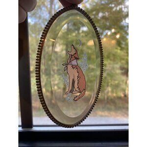 Howling Wolf Oval Glass Suncatcher With Brass Frame & Botanical Design