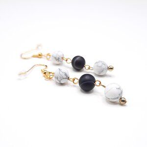 Handmade earrings with howlite & black striped agate gemstone beads. Made with gold-toned findings.