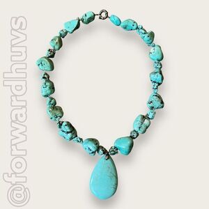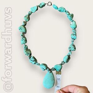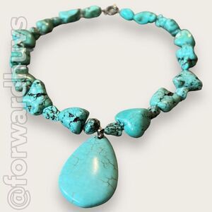 This listing is for a beautiful howlite necklace featuring stones that are individually tied together. The necklace has a bluish-green color with brown and black matrix patterns. Some of the stones may have white spots, as visible in the provided photos, adding to its overall appeal.