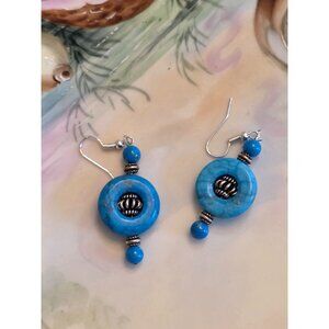 Elegant dangle earrings featuring howlite, Sleeping Beauty sky blue beads, and silver accents with a hook back design. Perfect for adding a touch of sophistication to any outfit.