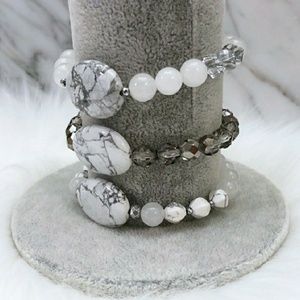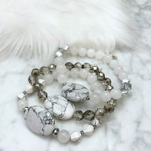 Natural white howlite statement Stone stretch bracelets with silver czech glass, white howlite, and white Jade beads + silver plated hematite