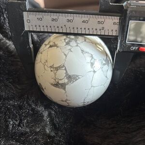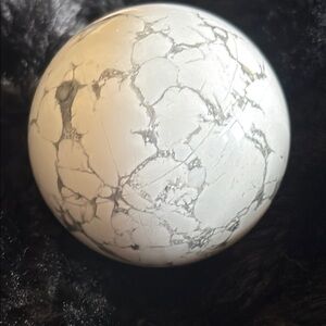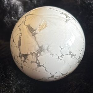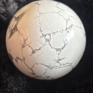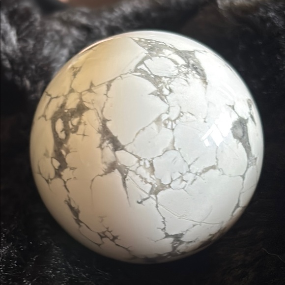 Howlite sphere. 60mm -Howlite is a white mineral with gray or brown veining, often used in jewelry and ornamental objects. It is a calcium borosilicate hydroxide and was named after Henry How, who discovered it in Nova Scotia in 1868. Metaphysically, howlite is known for its calming and soothing energies, helping to absorb negative emotions and promote peacefulness.