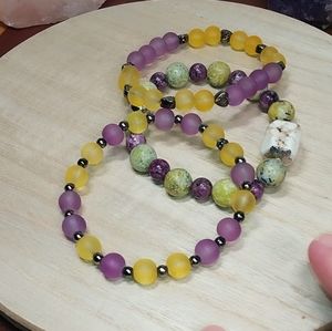 Three bracelet stack. Made with Howlite,Yellow"turquoise"(serpentine and quartz)10 mm and Violet Jade Beads 8 mm with stainless steel accents. and 2 purple and yellow glass beads 8mm bracelets with gun metal hearts. This one will fit up 6.5 to 7 in wrist.