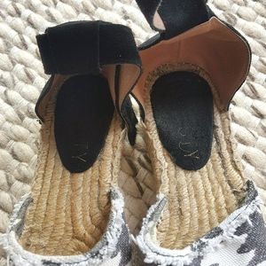 Adorable sandals from Howsty, a brand founded by two women in Madrid often featuring beautiful fabrics. These are made in Spain and feature ratan and rubber soles, fabric uppers, and synthetic suede like heel and ankle strap material. In gently used condition with only real flaw being the branding has mostly worn off the insoles (see 5th photo) and the brand isn't marked anywhere else for some reason. Only selling them because I need to down size and have too many shoes!