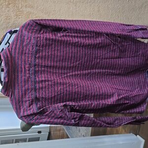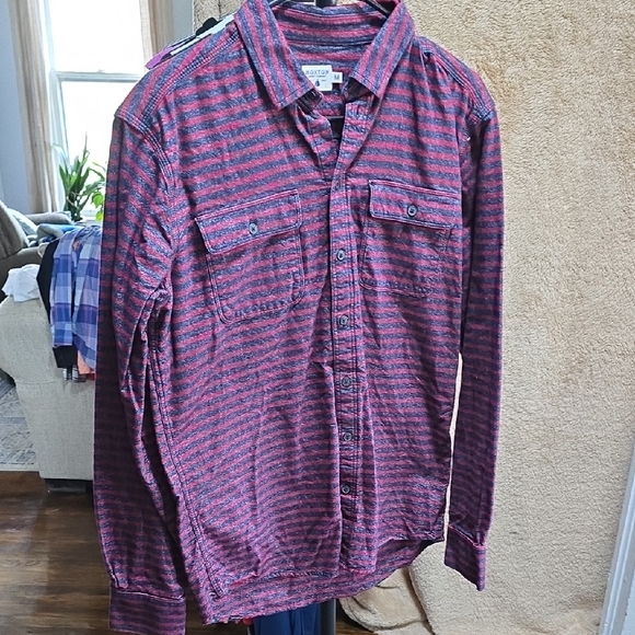 Comfortable long-sleeve button-down shirt with red and charcoal horizontal stripes. Two chest flap pockets for casual utility. Lightweight, breathable fabric for easy layering. Versatile everyday style in red and charcoal.