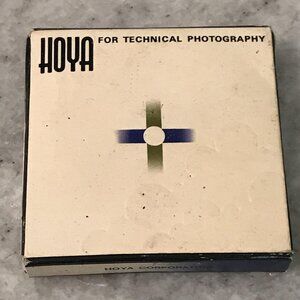HOYA filter in clear case with original box labeled "HOYA FOR TECHNICAL PHOTOGRAPHY" and side label "52.0s" HOYA factor guide molded into case lid