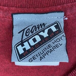 The Hoyt Archery Team Shirt is a men's large red tee with a graphic print featuring a deer antler logo. Made of cotton with a velvet fabric type, this short sleeve shirt has a crew neck and is machine washable. The shirt is designed with a regular fit for all seasons and is double-sided, making it perfect for fans of archery and sports. Preshrunk for durability, this shirt from the trusted brand Hoyt is ideal for those who appreciate quality and style in their wardrobe.