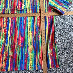 This vibrant multicolor polo shirt features a bold stripe pattern, blending comfort with a casual style. Ideal for adding a pop of color to your wardrobe.