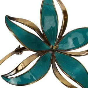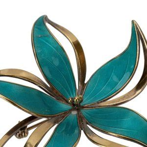 Item/Description: Norwegian designer, Hroar Prydz flower brooch. Beautifully crafted in gilt wash Sterling Silver and sky blue enamel. Curved petals with veining. Masterful detail. Roll-over clasp. Hallmarked: Sterling 925S maker's mark Norway.