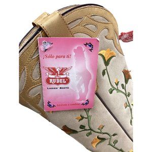 Elevate your wardrobe with Hu Duel's Women's Western Embroidered Heeled Boots. These boots feature a luxurious gold and cream color scheme, perfect for making a stylish statement. The detailed embroidery adds a touch of sophistication to any ensemble.