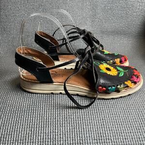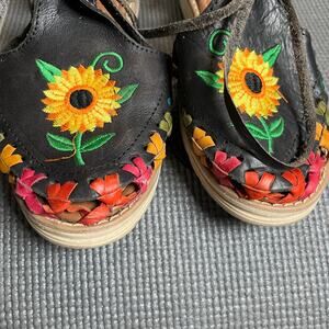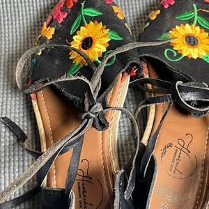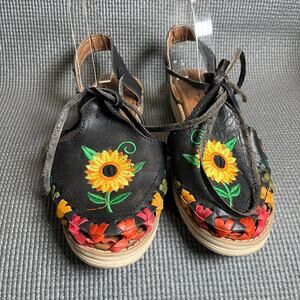 Huarache Sandals Womens Size 9 Black Floral Embroidered Slingback Handmade Mexican