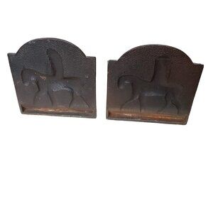 The bookends are in good antique condition, with a bit of rusty patina and paint that could be cleaned up. They are solid cast iron, probably about 75 years old, and have always been in my family. The artist’s name, G.S. Allen, is noted on the front, and the number 234 is on the back. The sculpture has very high relief and quality casting.