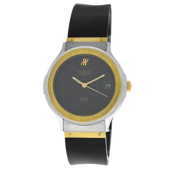 Hublot MDM Classic 1530.1 18k Yellow Gold Steel Date 36MM Unisex Automatic Watch. The watch is near mint condition with no visible scratches to the naked eye but may have some tiny scratches under close-up inspection. The watch hands have some discoloration due to the time, but it's only visible in the picture because of the magnification, not really visible in real life. The rubber strap shows some light signs of wear, please view detailed images of the strap. The watch was correctly polished by a professional polisher with beautiful matte steel and glossy gold details. The watch passed the water pressure test and we will include the printout of the test results. The automatic movement is in good working order and it keeps time within standards. Fits the wrist up to 7.25 inches. Authenticity is 100% guaranteed.